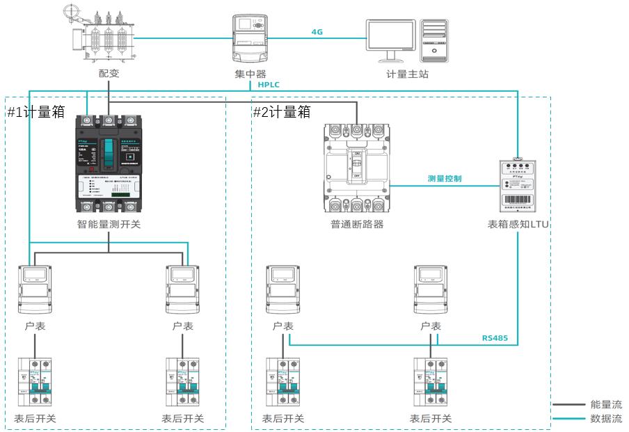 通過表箱進線處新裝智能量測開關(guān),或在普通進線開關(guān)基礎(chǔ)上加裝表箱感知LTU。利用開關(guān)或LTU的總表計量、HPLC上行通信、RS485自動搜表和抄表功能,實現(xiàn)檔案同步、竊電監(jiān)測、線損監(jiān)控和失準分析。同時通過開關(guān)或LTU的485下掛煙感和水浸傳感器,和開關(guān)本身的端子溫度監(jiān)測等功能,實現(xiàn)環(huán)境數(shù)據(jù)主動上報。實現(xiàn)“整箱計量”和“環(huán)境感知”的智能化表箱管理。